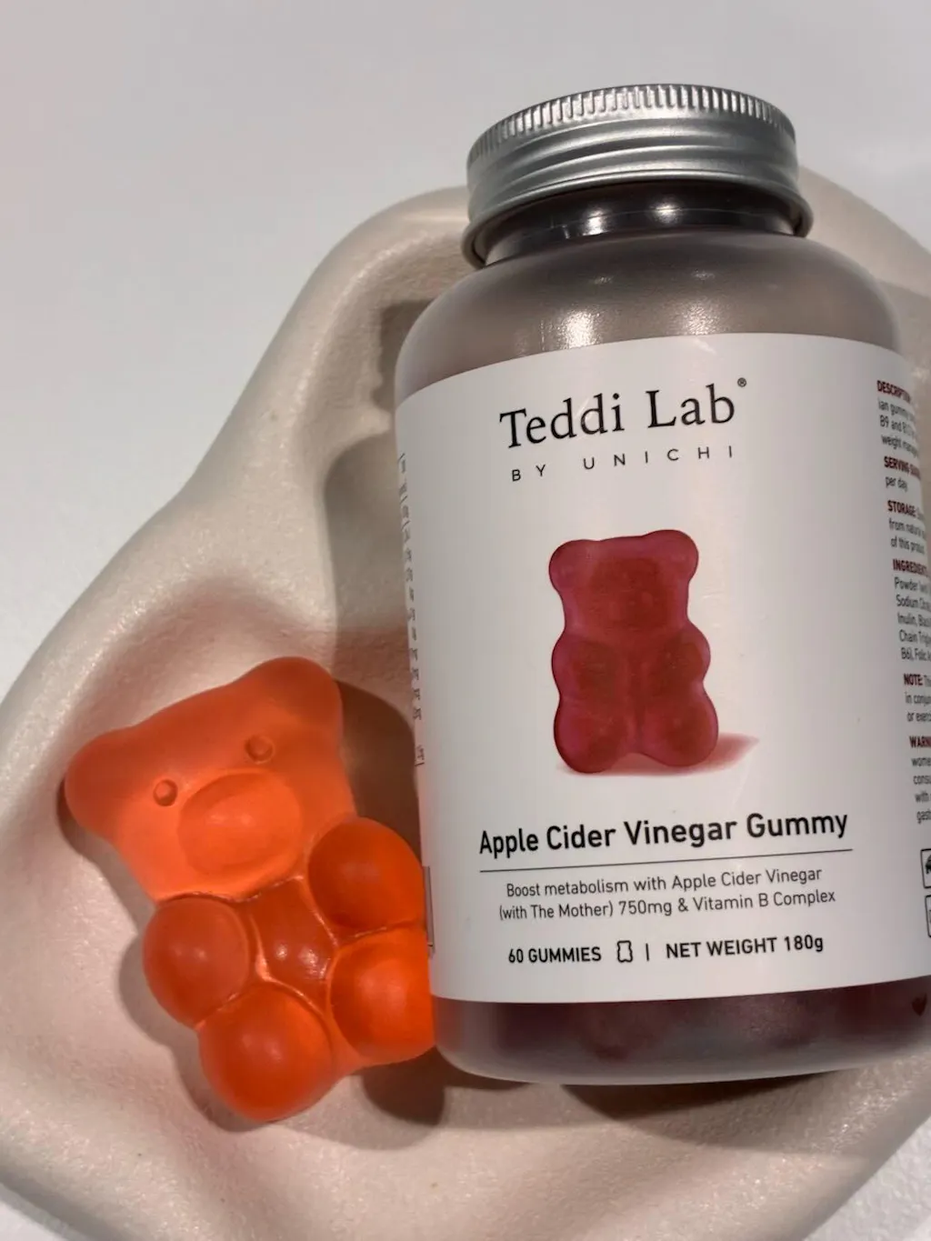 Teddi Lab Apple Cider Vinegar Gummy is a delicious vegetarian option that combines Apple Cider Vinegar with The Mother, along with Vitamin B6, B9, and B12 to support energy metabolism, heart health, immune function, and overall well-being.